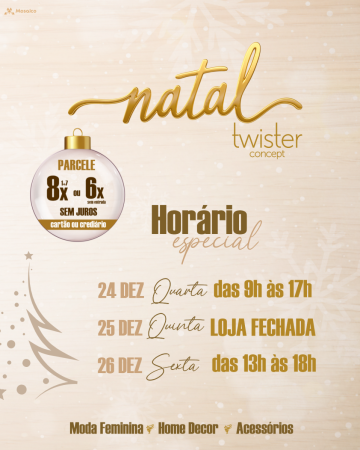 Desejamos que o Natal seja um momento de luz, alegria e união ao lado das pessoas mais importantes da sua vida. Que esta data renove energias e traga sentimentos verdadeiros de gratidão e esperança. E, para começar 2026 com o look perfeito, passe na Twister e descubra peças lindas para celebrar a virada com elegância e personalidade.